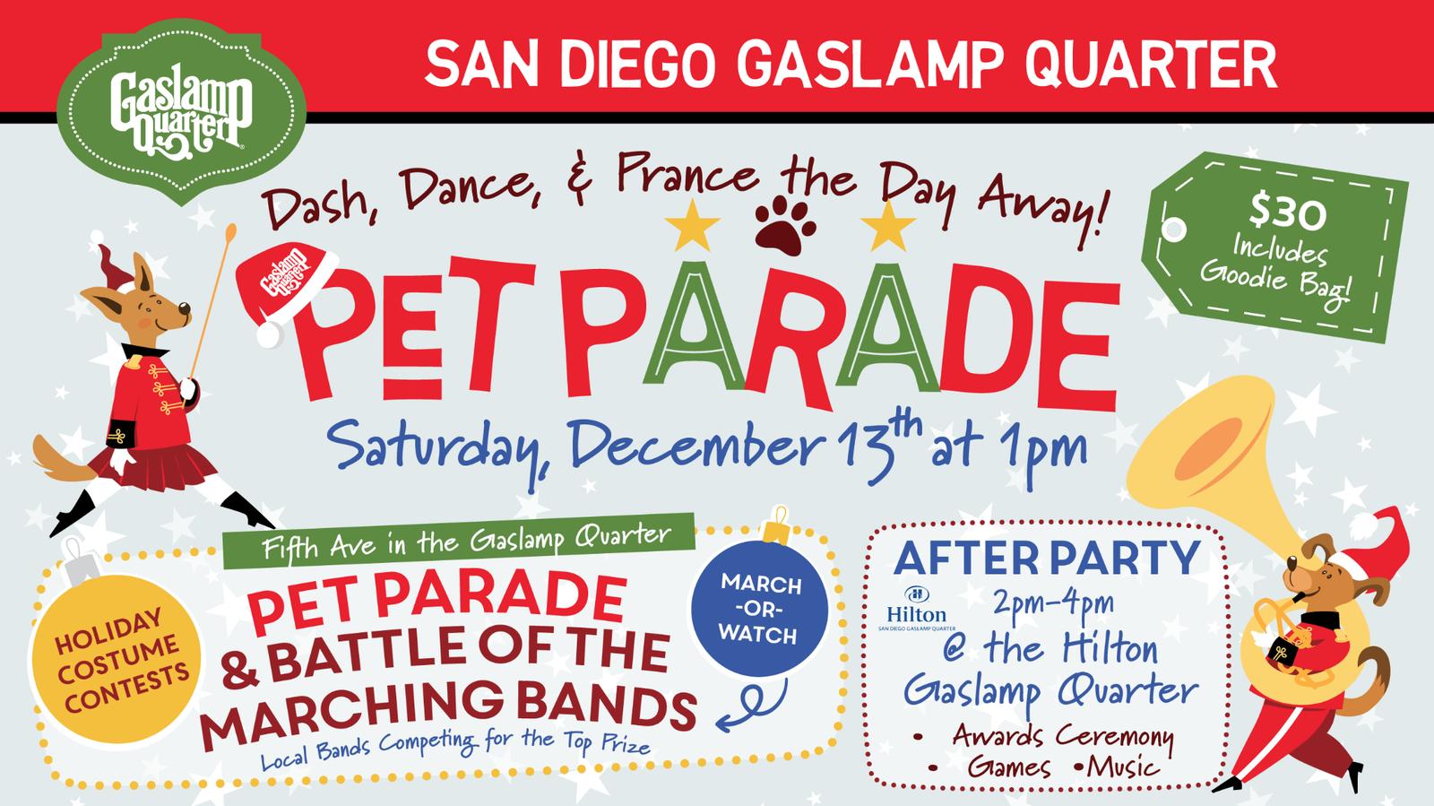 The Gaslamp Pet Parade & Pups in the Pub Party returns to the historic Gaslamp Quarter for a day full of holiday cheer, furry friends, and festive fun.