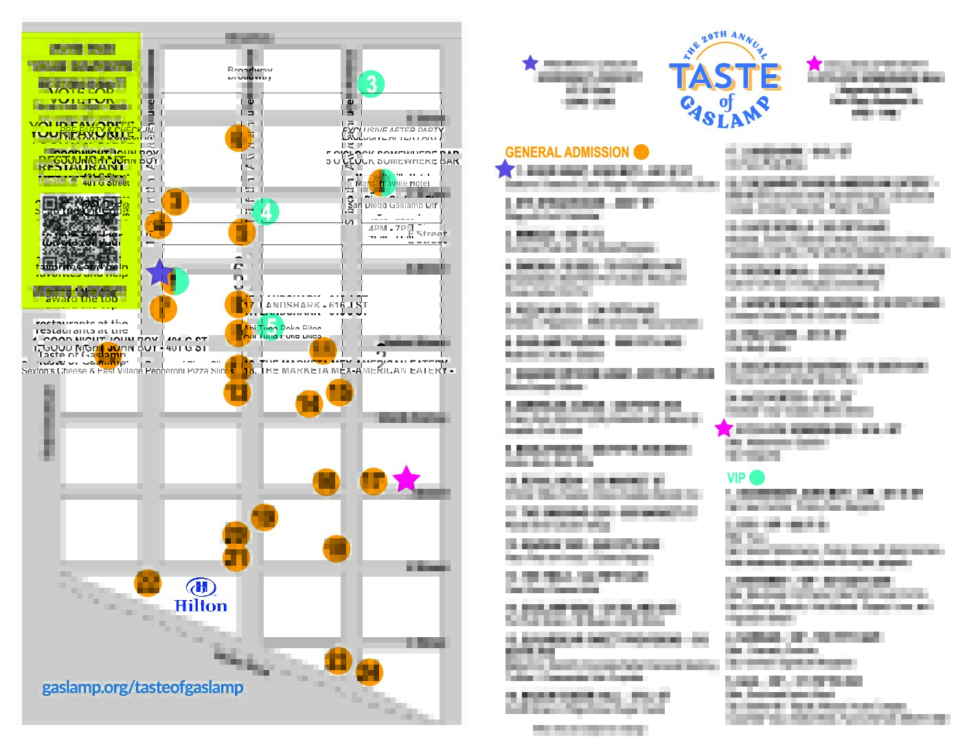 VIP Admission: VIP ticket holders gain exclusive access to 5 + exclusive additional bites, and sips from premiere Gaslamp Quarter restaurants! Plus the 20 + Taste of Gaslamp Quarter participating restaurants.